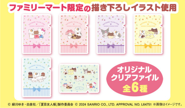 全国のファミリーマートにて「夏目友人帳×サンリオキャラクターズ」キャンペーン開催!対象商品を2個購入すると描き下ろしイラストを使用したオリジナルA4クリアファイル(全6種)が1枚もらえます♪ニャンコ先生とハローキティやマイメロディ、クロミなどのパステルカラーのコラボイラストがかわいい♥
