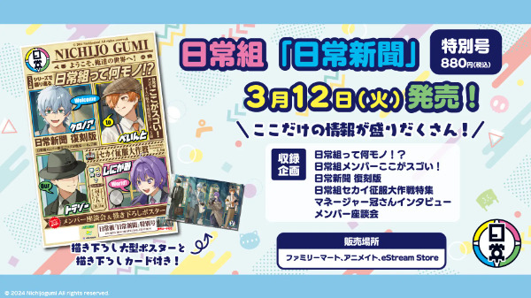 ゲーム実況グループ「日常組」が活動12周年を記念して「日常新聞」の発売が決定しました!収録企画にはメンバー座談会やマネージャーさんのインタビューなどこの新聞にしかない情報が盛りだくさん♪描き下ろしの大型ポスターとカードが付いた特別版と、缶バッジが4個も付いてくるeStream Store限定版の2種類がラインナップ。2024年3月12日(火)より全国のファミリーマートやアニメイトなどで取扱い開始されます。