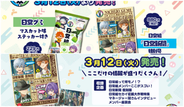 「日常組新聞」がファミマ(ファミリーマート)やアニメイト、eStreamにて販売決定!缶バッジ付きやポスター&カード付きの2種がラインナップ♪様々な情報が盛りだくさんの内容なので楽しみ♡2024年3月12日(火)より取扱い開始。
