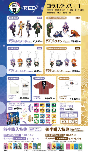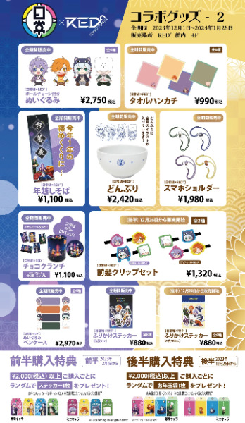 | 特典 | ・入場特典 クリアファイル1枚 ・グッズ購入 【前半】税込2,000円以上購入でステッカー1枚(全8種・ランダム) 【後半】税込2,000円以上購入でお年玉袋1枚(全8種・ランダム) ・コラボカフェ 【前半】ランチョンマット 全1種 【後半】絵馬型ポーチ 全1種 ・謎解き(クリア後) 【前半】クリスマスメッセージカード 全1種 【後半】くじ付き年賀状 全3種 |