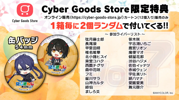 にじさんじチップスは箱買いの特典デザインがいいですよね。缶バッジの背景がチップス柄なのがたまりません。近くに販売店がない人でも、 Cyber Goods Storeで買えるのはありがたいですよね。 店舗巡りしなくても確実にゲットできるのは助かります🙏