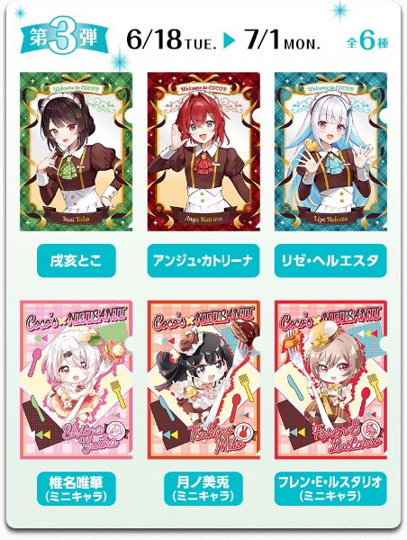 「にじさんじ」×「ココス」コラボ開催!コラボメニューを含む対象メニュー1品につきクリアファイルを1枚プレゼント!参加ライバーは笹木咲や椎名唯華、月ノ美兎など豪華9人!第1弾は5月21日、第2弾は6月4日、第3弾は6月18日よりスタート!
