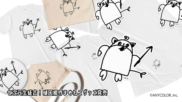 「七次元生徒会!」の初グッズが登場します!動画の企画で樋口楓が描いたあの「まめねこ」のイラストが本当にグッズ化!2024年1月4日(木) より、にじさんじ公式BOOTHにて販売開始されます。動画で言及されていた缶バッジやステッカーを筆頭に、Tシャツ、サコッシュ、アクリルキーホルダーの5種類のグッズをラインナップ。ユニークなイラストがかわいい♡