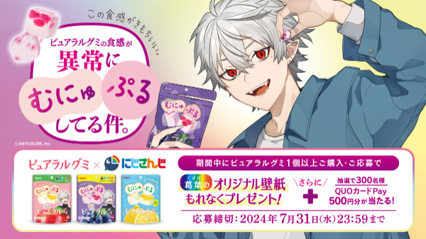 ピュアラルグミの食感が異常にみゅにゅぷるしてる件。として商品を手に持つPRビジュアルも公開されました♪もれなくもらえる葛葉のオリジナル壁紙プレゼントキャンペーンも開催されますので、ゲットしよう!