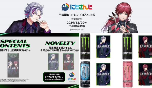 にじさんじの不破湊さんとローレンさんが、アサヒ飲料「モンスターエナジー」とのコラボキャンペーンを紹介する配信が行われました🎉。二人はモンスターエナジーの多様なフレーバーを紹介し、視聴者と一緒に楽しみながら、その魅力を伝えました。特別キャンペーンも開催中で、Amazonにて商品購入者にはコラボカードと、撮り下ろし壁紙画像がプレゼントされます🌟モンスターエナジーでエナジー全開💥