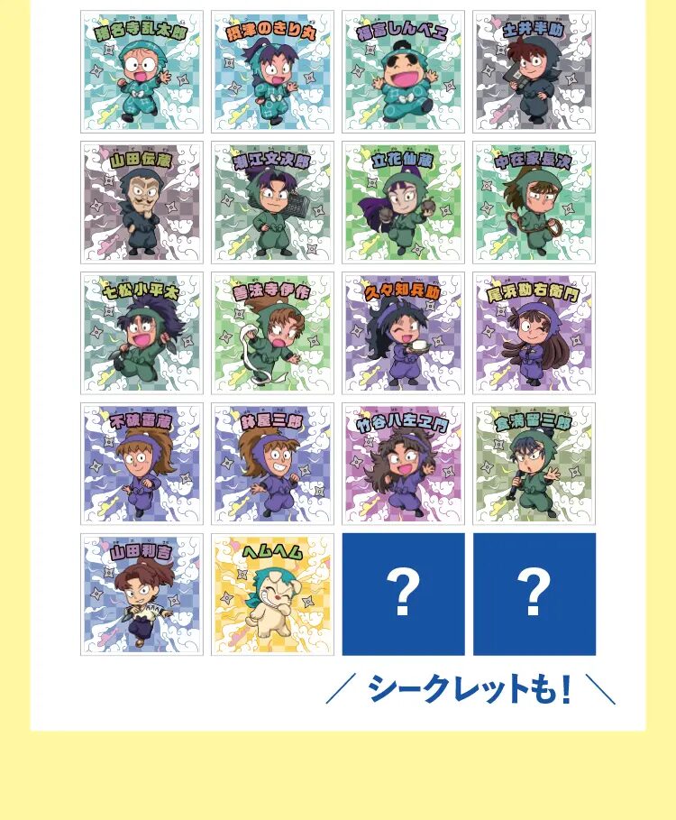 A.全部で20種類用意されているよ 🥷 そのうち18種類が通常のキャラクターシールで、残りの2種類が激レアなシークレットシールなんだ 🌟 どのシールが当たっても嬉しいコレクションになるね 🎵