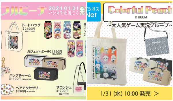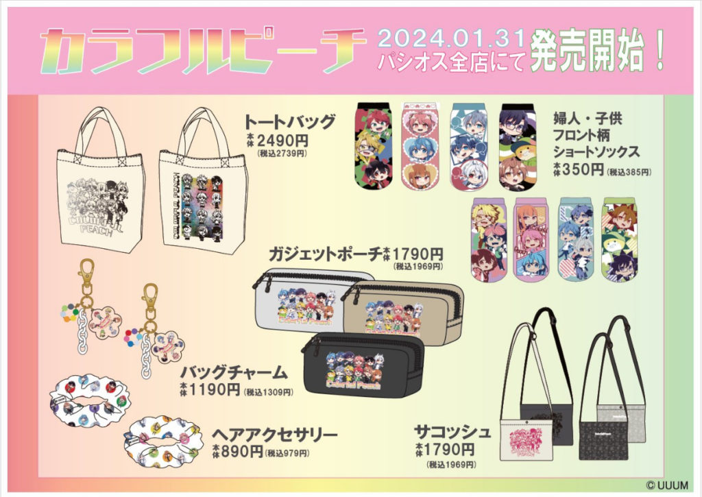1月31日より、人気のゲーム実況グループ「からぴち(カラフルピーチ)」の商品が発売されます♡トートバッグや靴下、ヘアアクセサリーなど、可愛いグッズが多数♪パシオスの店舗、またネットでも発売されます! パシオスのカラフルピーチグッズ新作2024年8月発売はこちら。