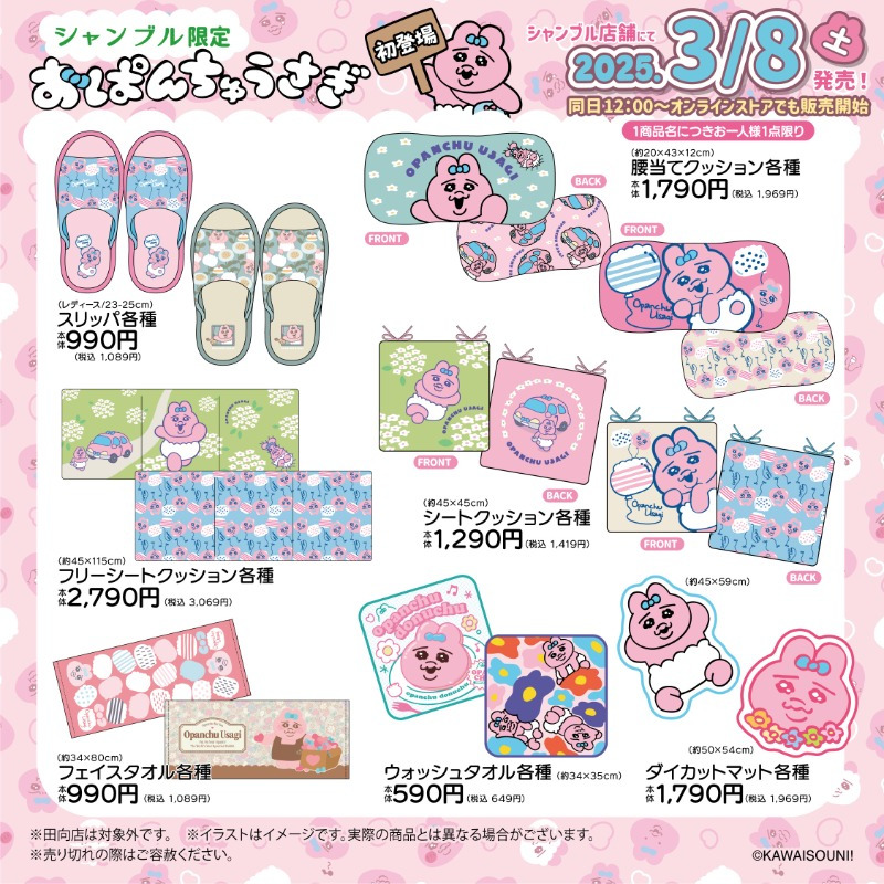 | 販売場所 | ・全国の『シャンブル』各店舗(https://shimamura.gr.jp/shop/chambre/) ・しまむらオンラインストア(https://www.shop-shimamura.com/disp/itemlist/おぱんちゅうさぎ) ※一部商品については、店舗限定商品もしくはオンライン限定商品となります。 |
