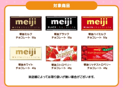 | 明治ミルクチョコレート/明治ブラックチョコレート /明治ハイミルクチョコレート /明治ホワイトチョコレート /明治ストロベリーチョコレート |