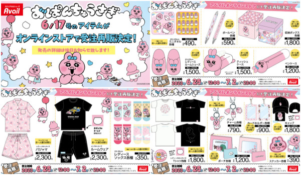 6月のアベイル×おぱんちゅうさぎグッズは、オンラインで再販受注。総柄パジャマやTシャツ、ペンケースなどかわいいグッズがラインナップしています。