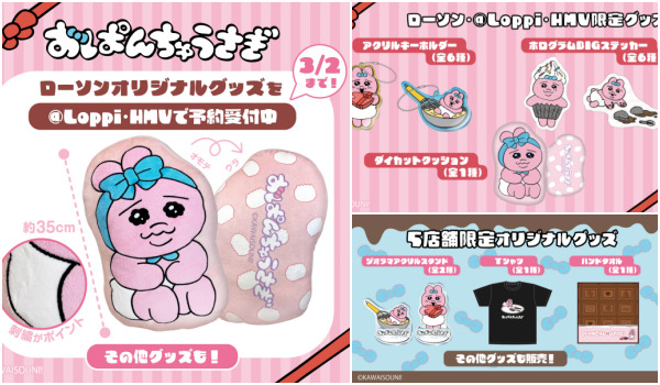 2023年2月から、おぱんちゅうさぎのダイカットクッションやアクキー、アクスタ、Tシャツなどがローソン店舗&Loppi/HMV限定グッズとして登場。