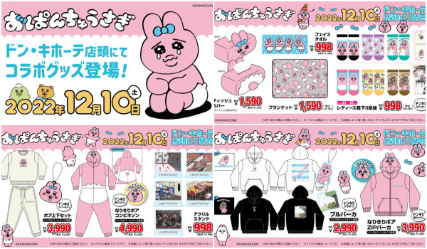 ドンキホーテにて、202年12月10日より、おぱんちゅうさぎグッズが発売!パーカーや靴下などアパレルアイテムが登場。特に注目は着ぐるみみたいに着られる「なりきりボアコンビネゾン」!これであなたもオパンチュウサギ!ドンキ限定缶バッジも付いてきます。