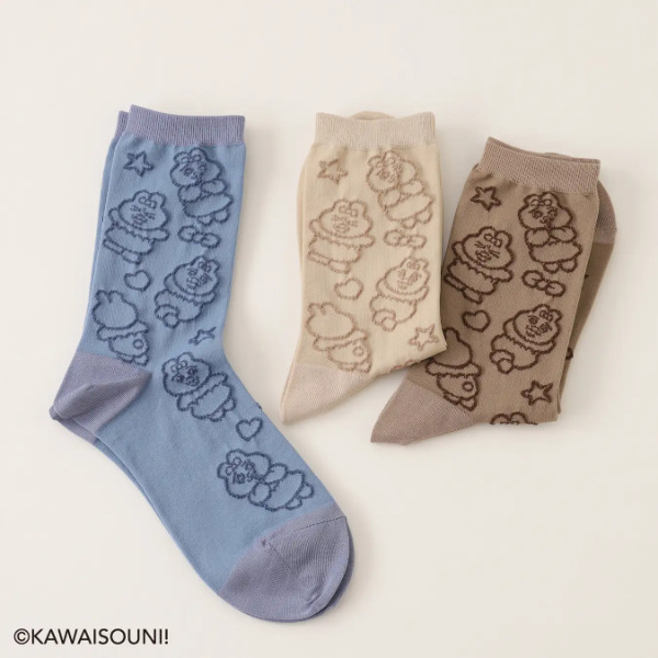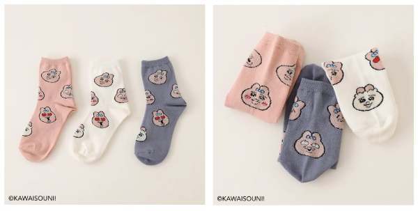 おぱんちゅうさぎと靴下屋コラボソックスは、全3種類、各3色展開。ワッペン風の刺繍ソックス、立体的な凸凹でキャラクターが描かれたフロート編みソックス、モール糸使用の総柄ソックスとそれぞれ個性的でおパンチュウサギの可愛さが引き出された仕上がりとなっています。
