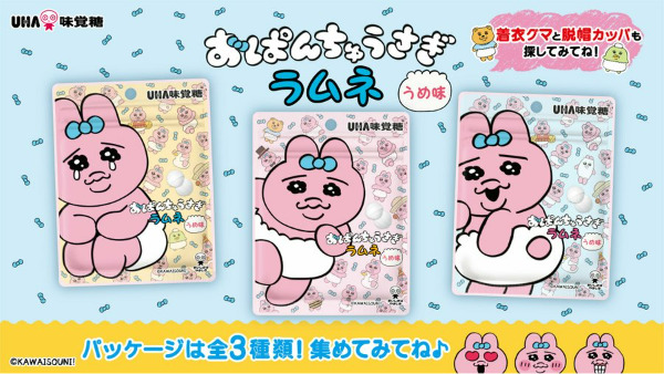 おぱんちゅうさぎがUHA味覚糖とコラボ♪おぱんちゅうさぎラムネが5月29日から全国で発売中♡夏場もスッキリのうめ味!パッケージも3種類あるよ♡着衣グマと脱帽カッパも探してね♪