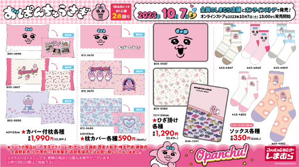 | 販売場所 | ・全国の『ファッションセンターしまむら』各店舗(https://www.shimamura.gr.jp/shop/) ・しまむらオンラインストア(https://www.shop-shimamura.com/disp/itemlist/おぱんちゅうさぎ) ※一部商品については、店舗限定商品もしくはオンライン限定商品となります。 |