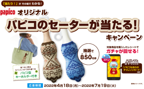2022年「パピコのセーターがもらえる!キャンペーン」は、パピコ購入者を対象とした抽選プレゼント企画。期間中、対象のパピコ商品を購入し、レシートを撮影・アップロードして応募すると、オリジナルデザインの「パピコのセーター(ボトルカバー)」とパピコ型キーホルダーが当たるチャンス!応募はスマートフォンからのみ可能で、Glicoメンバーズへの登録が必要。当選者は応募時にその場で当たりが分かる「ガチャ」形式で決定され、仮当選後にレシート内容の確認を経て正式当選となります。