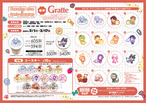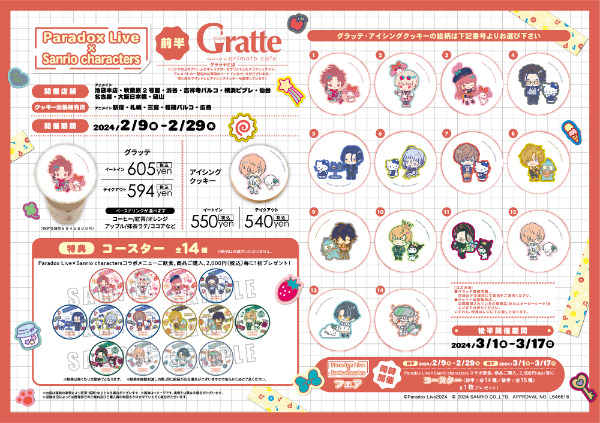 パラライ×サンリオinグラッテ開催!ドリンクの上のクリームにキャラクターをプリントした“グラフィックラテ”「グラッテ」とアイシングクッキーを販売。クッキーのみの出張店舗も展開。「Paradox Live × Sanrio characters」コラボ飲食、商品購入2,000円(税込)毎に特典コースターがもらえます。グラッテ・アイシングクッキー・コースターで使用されるイラストは前半14種、後半15種をご用意。※数量限定。無くなり次第終了。