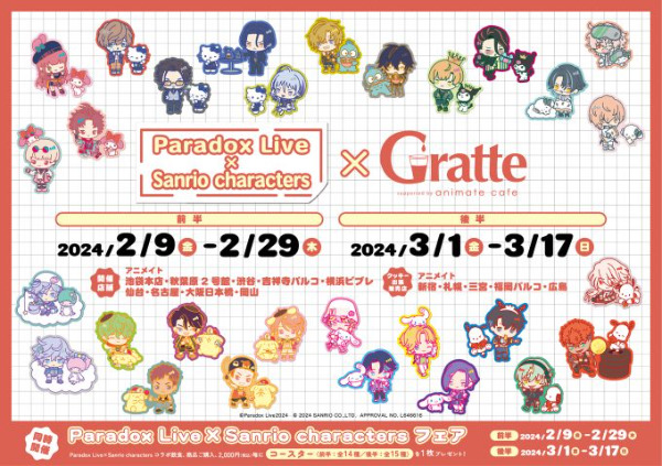 パラライ×サンリオinグラッテ開催!パラライとサンリオキャラのかわいいイラストを使用したグラッテとアイシングクッキーを販売!コラボ飲食、商品購入2,000円(税込)毎に特典コースターをプレゼント!前半14種、後半15種のイラストをラインナップ!。アニメイトコラボカフェ2024!