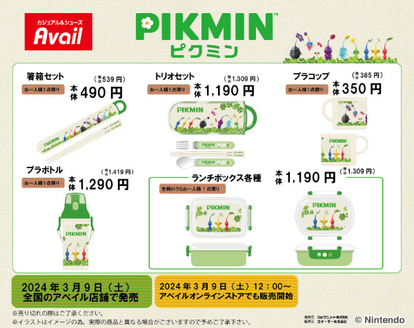 大人気キャラクターピクミンがアベイルとコラボ決定!2024年3月9日(土)から対象店舗、オンラインストアで発売開始されます。水筒やお箸セット、お弁当箱などピクニックや新学期にぴったりなアイテムがラインナップ!ピクミングッズで揃えて新学期を迎えると気分も上がる♡オンラインストアで購入できるのも嬉しいですね♪取扱い数量限定で、無くなり次第終了なので見つけたらすぐにゲットしよう!