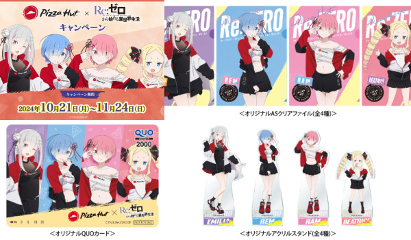 ピザハットがTVアニメ『Re:ゼロから始める異世界生活』とのコラボキャンペーンを開催。クリアファイルや豪華グッズがもらえるチャンス♪ エミリア、レム、ラム、ベアトリスの4人がピザハットカラーの赤&黒をベースにした衣装を着たデザインがかわいい♪Q.どこで?A.全国のピザハット Q.クリアファイルはいつからいつまで?A.2024年10月21日~11月24日 ※数量限定。なくなり次第終了