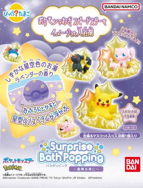 ポケモンの“わざ”スピードスターがバスボムに🎉星が舞うおふろタイムを楽しめる「びっくらたまご バスポッピング ポケモン ~星降る夜に~」が発売決定💫ピカチュウやミュウなど人気ポケモンのマスコットが、入浴後もキラキラ飾れる台座つきで登場!
