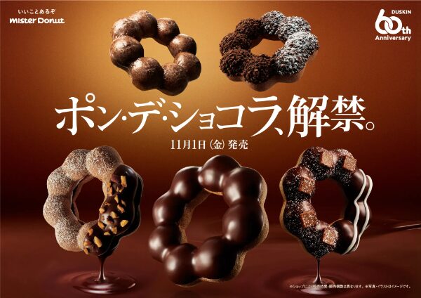 今年もやってきた!ミスド冬の名物「ポン・デ・ショコラ」シリーズが11月1日(金)より期間限定で登場。チョコの香りともちもち食感がたまらない大人仕様にパワーアップして帰ってきます!新作2種を加えた全5種類で、ショコラの世界へようこそ。