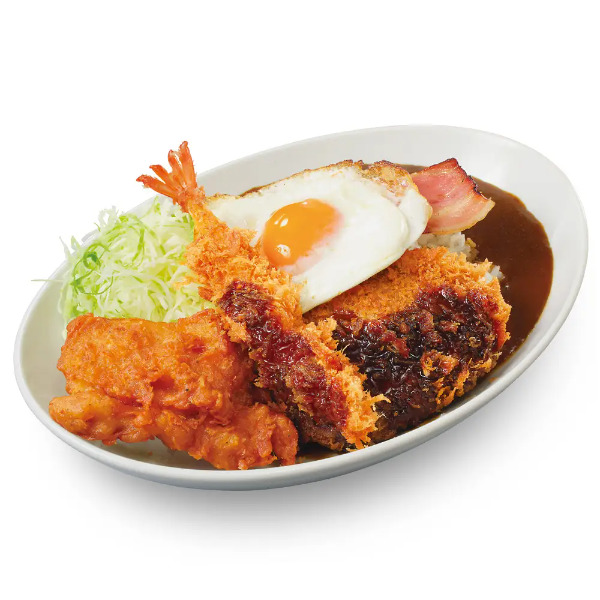 かつやの新商品はフル盛りでエビフライとかフライ系はあるあるだけど、ベーコンエッグもカレーものせてくれるの夢がある