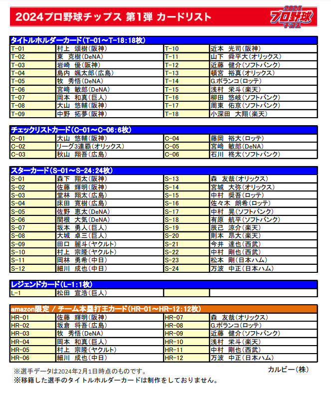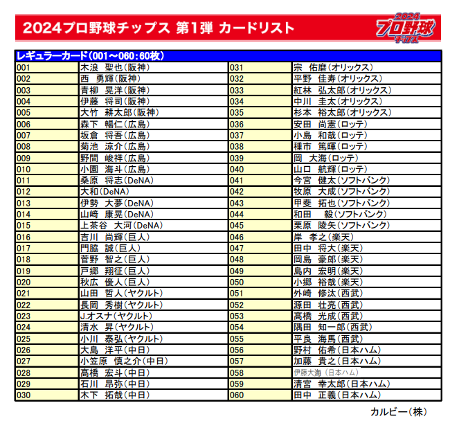 カードリスト:https://www.calbee.co.jp/products/cardlist/proyakyu/baseball2024a.pdf