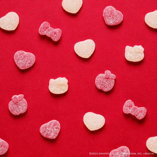カンロの人気グミブランド「ピュレグミ」と、世界中で愛されるハローキティがコラボレーション。キティをイメージした“りんご味”のピュレグミは、フレッシュな甘ずっぱさと心地よい果肉食感が特徴です。グミ粒は赤と白の2色アソートで、ハート型のほか、キティのお顔・リボン・りんご型など、開けるたびに楽しいデザイン入り。パッケージは全5種類で、キティがウインクしたり、ミミィと並ぶ姿などレトロで可愛いイラストがポイント。日常のおやつにはもちろん、友人とシェアしても気分が上がる限定アイテムです。