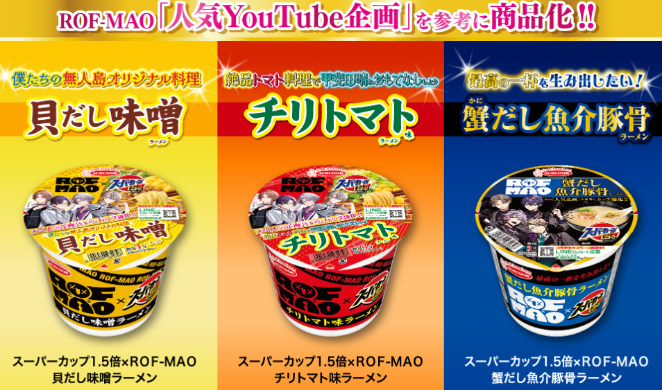 | コラボパッケージ商品名 | 【スーパーカップ1.5倍】 しょうゆラーメン/みそラーメン/とんこつラーメン/豚キムチラーメン/野菜タンメン/ブタキムラーメン(コンビニ限定) 【スーパーカップ1.5倍】 ROF-MAO 蟹だし魚介豚骨ラーメン/ROF-MAO 蟹だし魚介豚骨ラーメン/ROF-MAO チリトマト味ラーメン いか天ふりかけ焼そば |