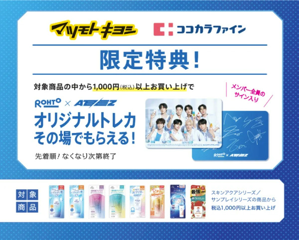 | 内容 | マツキヨココカラの店頭で下記対象ブランドの商品から税込1,000円以上購入した人、にその場でROHTO×ATEEZオリジナルトレカをプレゼント。 対象商品 ロートUVの「スキンアクアシリーズ」「サンプレイシリーズ」の商品 |