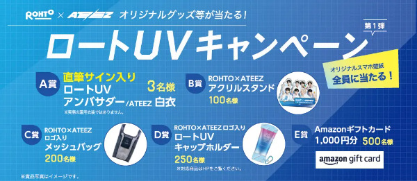 | 賞品および当選者数 | A賞 直筆サイン入り白衣 (3名様) B賞 ROHTO×ATEEZ オリジナルアクリルスタンド(100名様) C賞 ROHTO×ATEEZ ロゴ入り メッシュバッグ(200名様) D賞 ROHTO×ATEEZ ロゴ入り ロートUVキャップホルダー(ブルー)(250名様) E賞 Amazonギフトカード1,000円分(500名様) 全員 オリジナルスマホ壁紙 |