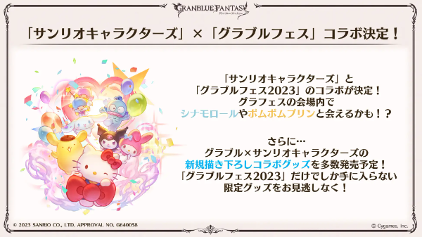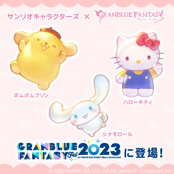 サンリオキャラクターズとグランブルーファンタジーがコラボ!2023年12月23日(土)、24日(日)に開催されるグラフェス2023限定企画として、新規描き下ろしコラボグッズにはマスコットチャームやトレーディングアクリルキーホルダーなどかわいいアイテム多数登場!グラフェス会場内でサンリオキャラクターズに会えるかも!?