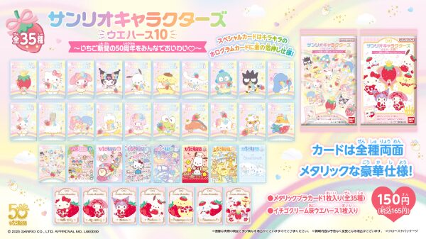 🎀バンダイから「サンリオキャラクターズ ウエハース10」が発売されるよ〜!今回はいちご新聞50周年のお祝い仕様で、歴代の表紙や記念イラストがデザインされた豪華カード付き♡