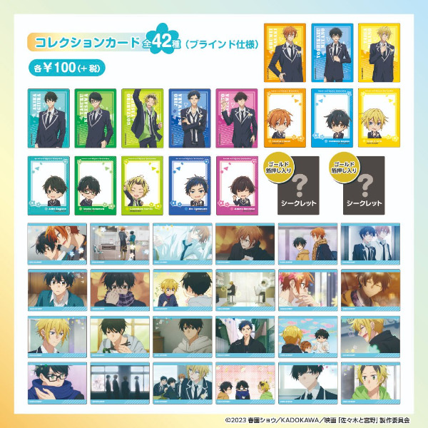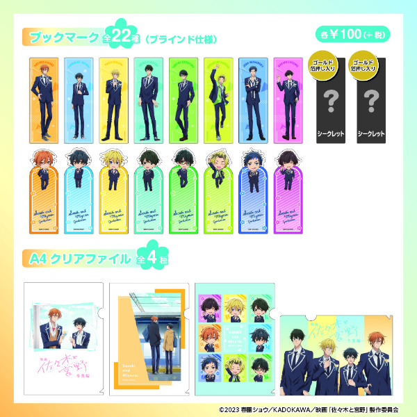 100円ショップのセリアにて、「佐々木と宮野(ささみゃー)」のグッズが登場します!2023年11月下旬より順次販売。コレクションカードやA4クリアファイル、ブックマークなどのグッズがラインナップされています。コレクションカードとブックマークにはゴールド箔押し入りのシークレットデザインも♪