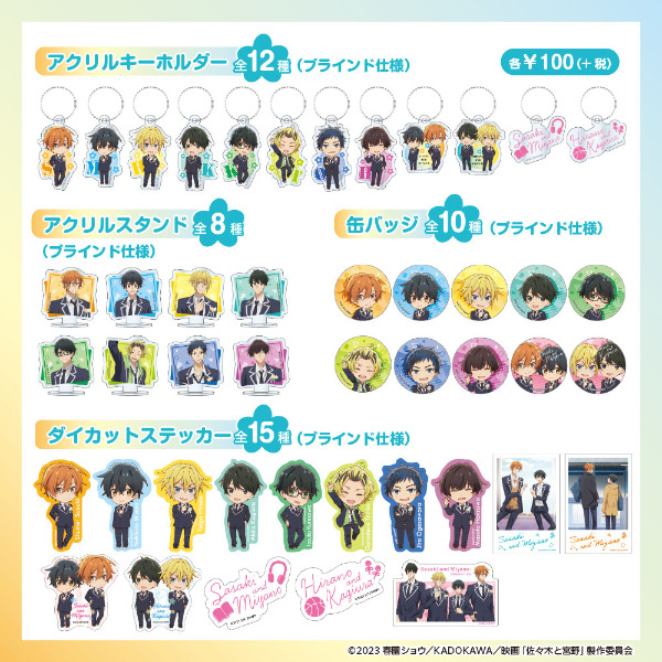 「佐々木と宮野(ささみゃー)グッズ」のグッズが100均セリアに登場!アクリルスタンドや缶バッジなどをラインナップ。等身やミニキャラ、劇中の名シーンなど様々なデザインを使用したバラエティ豊かな内容となっています。2023年11月下旬より順次販売♪