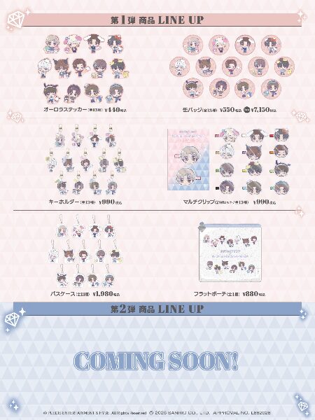 第1弾では、オーロラステッカーや缶バッジ、キーホルダー、マルチクリップ、パスケース、フラットポーチなど、ファン垂涎のアイテムが多数ラインナップされています。