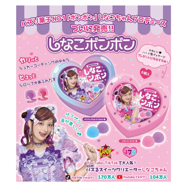 YouTubeやTikTokで大人気の しなこちゃん がプロデュースした、新感覚のキャンディ「しなこボンボン」💖✨ 外側はシュガーコーティングで カリッと 心地よい食感! ひとくち噛むと、 中からとろ~りシロップ があふれ出す、クセになる美味しさ😍