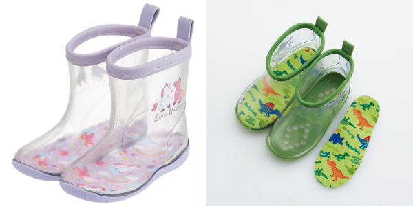雨の日もメルヘン気分で楽しく過ごせる、ユニコーン柄の透明レインブーツと、恐竜柄のスケルトン長靴。履き口はしっかりしたパイピング仕上げ、カラフルな中敷きは取り外して乾燥できるので、衛生面も安心。反射タブ付きで安全性も高く、3~4歳前後のお子様にぴったりのサイズ感です。