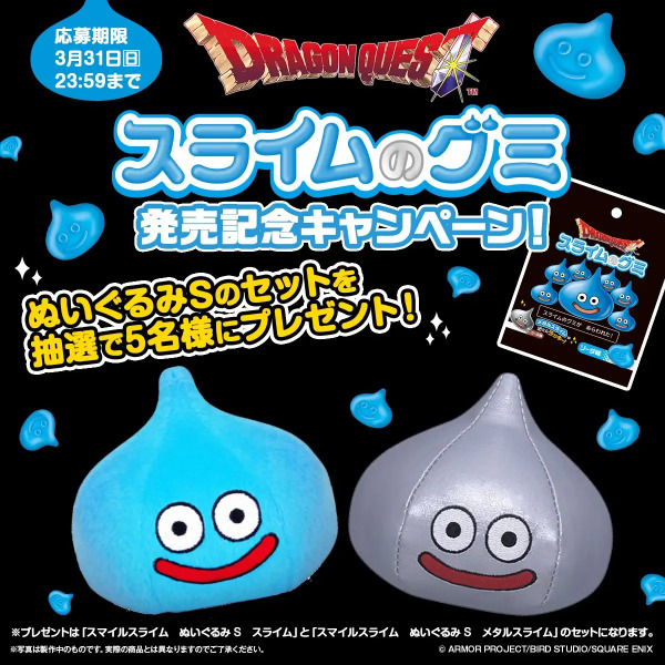 | 応募方法 | 「SQUARE ENIX Official Goods」公式Xアカウント(@SQEX_MD_GOODS)をフォローして、開催期間中に対象ポストをリポストした方の中から抽選で5 名の方にスライムとメタルスライムのぬいぐるみセットが当たる。 |