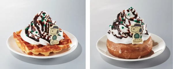 ワッフル&ドーナツもご褒美仕様に! 定番のアメリカンワッフル&シュガードーナツが、ホイップ&キャラメルチョコレートソース、グリーンハートシュガー、スヌーピーのチョコトッパーでおめかし♪ 見ても食べても幸せになれるスイーツです!