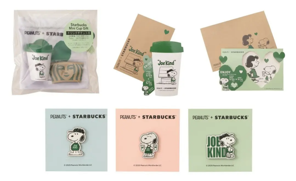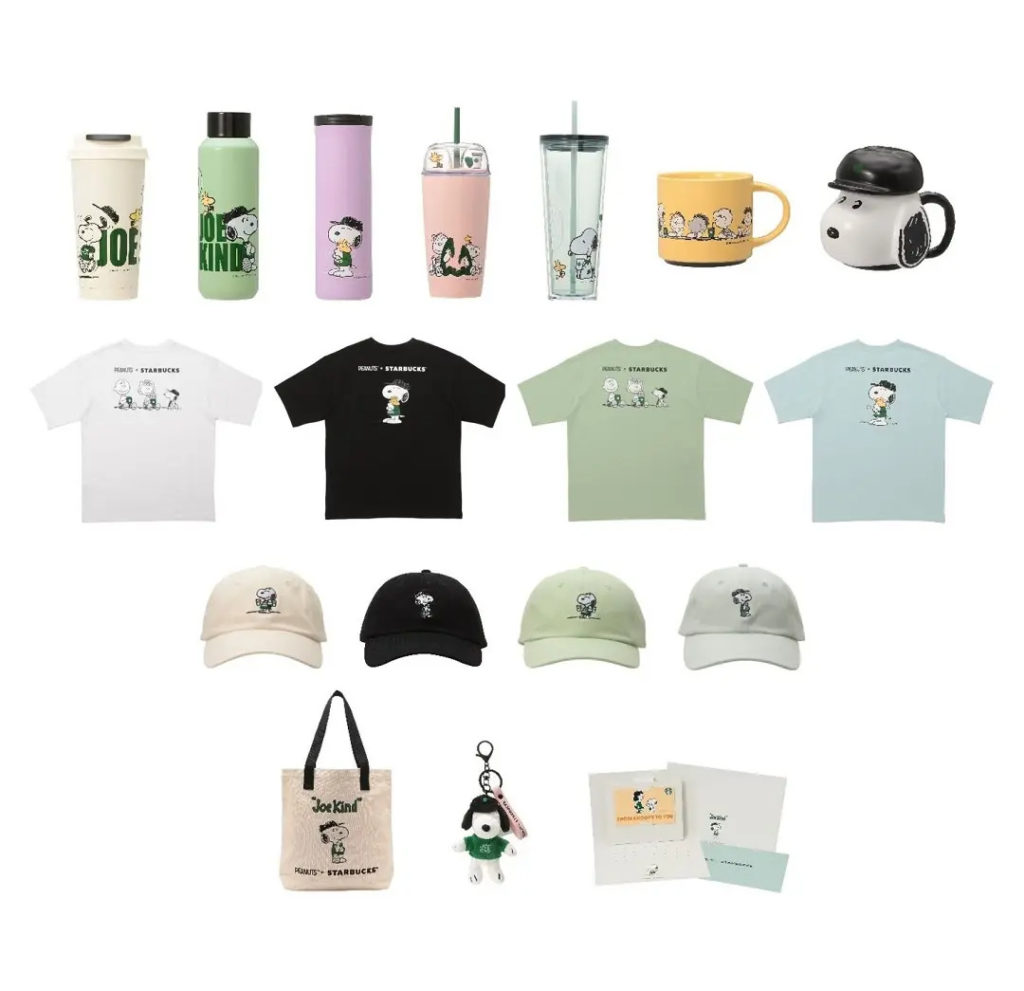 『JOE KIND SNOOPY』デザインのタンブラーやライフスタイルグッズ、全24種類がラインナップ! 中でも、ビバレッジカードやミニカップギフト、トートバッグ、Tシャツ、キャップは、日本限定の特別アイテムです。