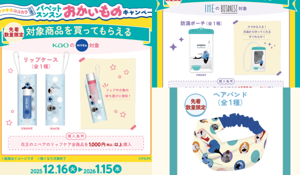 もらえる期間は12月16日(火)から2026年1月15日(木)までと、比較的長めですが、ノベルティは先着順です!💨 ニベアリップケアやボタニストヘアケアは全商品が対象なので、これを機にまとめ買いをして、一度のお買い物で複数のグッズを狙うのが効率的なスン活になりそうです。引換画面の提示も忘れずに! ミニサイズはビオレのキャンペーンの対象外なので、そこだけ注意して、全3種類の限定グッズを確実にゲットしましょう!