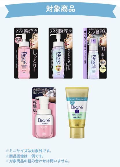 A. 花王のビオレ洗顔料・メイク落とし全商品を2点以上購入することが条件ですが、ミニサイズの商品は対象外となる点にご注意ください。