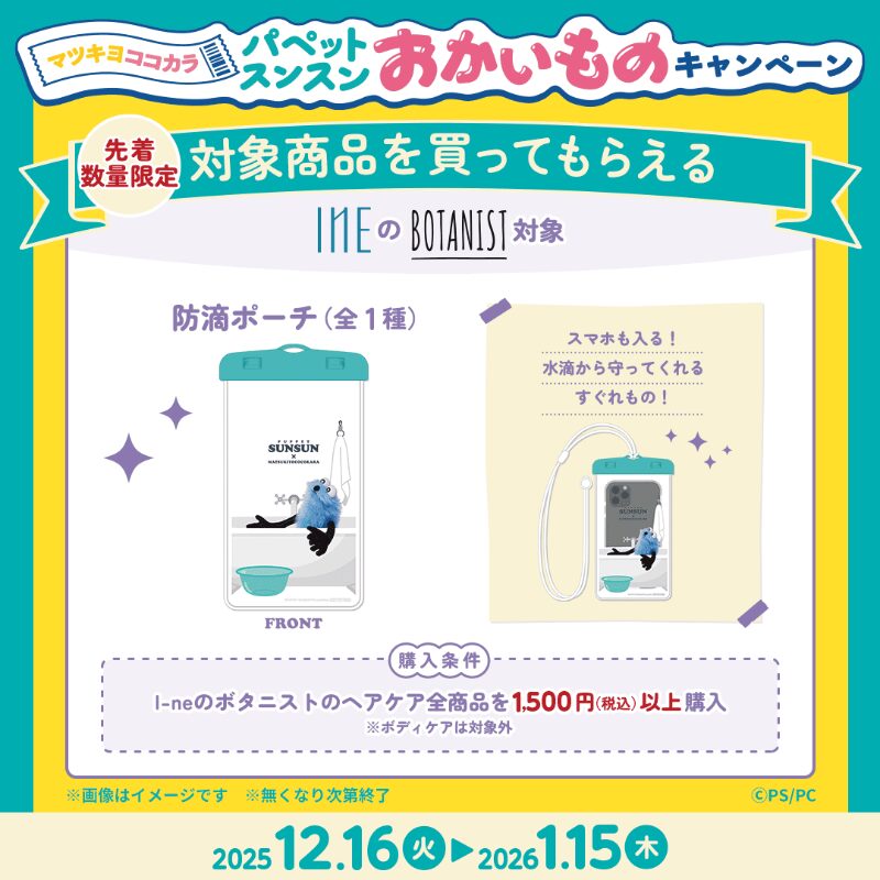 「パペットスンスン」と「マツモトキヨシグループ・ココカラファイングループ」による「スンスンおかいものキャンペーン」の第2弾が、12月16日(火)よりスタートします。このキャンペーンでは、花王のニベア リップケア、I-neのボタニスト ヘアケア、そして花王のビオレブランド商品といった、冬の美容に欠かせない対象商品を購入することで、先着数量限定のオリジナルグッズがプレゼントされます。ニベアリップケア全商品を1,000円(税込)以上購入で「スンスン リップケース(全1種)」、ボタニスト ヘアケア全商品を1,500円(税込)以上購入で「スンスン 防滴ポーチ(全1種)」、ビオレ洗顔料・メイク落とし全商品を2点以上購入で「スンスン ヘアバンド(全1種)」がもらえます。ノベルティは、引換画面を提示することで先着でプレゼントされ、各景品とも2026年1月15日(木)までがもらえる期間ですが、数量限定のため、早めの参加が推奨されます。スン活をしながら、冬の乾燥対策も万全にできる、ファンにとって見逃せないキャンペーンです。