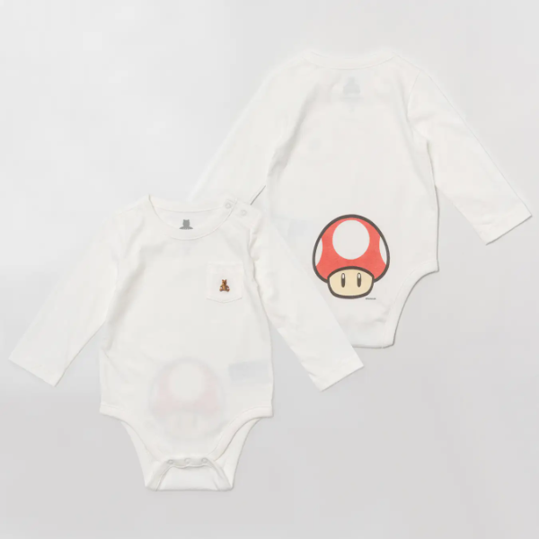 マリオのコラボ服レアなので、GAPコラボおしゃれでいいですね!これを機にプレミアムアウトレットに行くのも楽しそうです。パーカーやトドラーボーイズ可愛すぎます。ベビー用のボディスーツのおしりにはスーパーきのこ。シンプルな白いボディスーツっていうところがGAPらしくてかわいいですね。