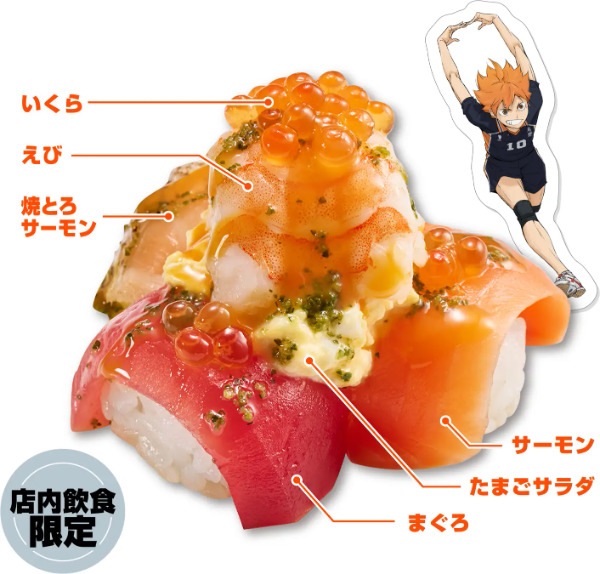 えび、アボカド、マヨネーズを組み合わせた「飛べ!!えびアボカド包み」は、若者に人気のネタを使用した包み寿司です。このメニューには、『ハイキュー!!』のミニキャラがデザインされた特製ピック(全20種)がランダムで付いてきます。価格は税込260円からで、3月5日より販売開始。お気に入りのキャラクターが当たるか、お楽しみ。特製ピックはランダム提供のため、デザインは選べません。