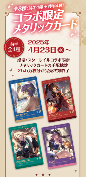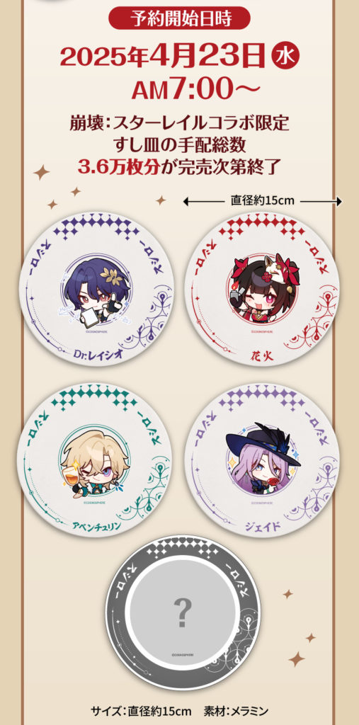 スシローと人気ゲーム「崩壊:スターレイル」のコラボキャンペーン『夢を重ねて』が、2024年4月23日(水)〜6月1日(土)に開催!対象メニューの注文で限定オリジナルグッズがもらえるほか、描き下ろしビジュアルを使用した「クリアカード」や「クリアボトル」、「すし皿」付きメニューも登場。ゲーム連動のコンテンツや、特別なSNSキャンペーンも実施されます。Q.グッズはどこで売ってる? A.全国のスシロー店舗(一部除く)Q.いつからいつまで? A.2025年4月23日~6月1日