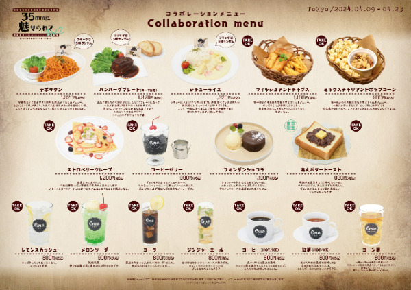 | 来店方法 | 【テイクアウト】 そのまま来店してください。 ※混雑状況により予約制もしくは整理券制となる場合があります。 ※グッズのみの購入はできません。テイクアウト飲食メニューを1品以上注文してください。 【店内飲食】 先着予約制 ※予約は「コラボカフェトーキョー」アプリもしくはWEBにて予約が可能です。 ※当日空席がある場合は予約なしでも案内可能です。 コラボカフェトーキョー (collabocafe.tokyo) |