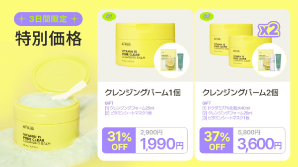 たけたろう×アヌア(ANUA)コラボ開発!ビタミン15 ポアクリア クレンジングバーム発売!!QOO10(キューテン)にて取扱い。共同開発を記念して3日間限定で特別セールを実施♪さらに先着特典としてフォトカードをプレゼント!